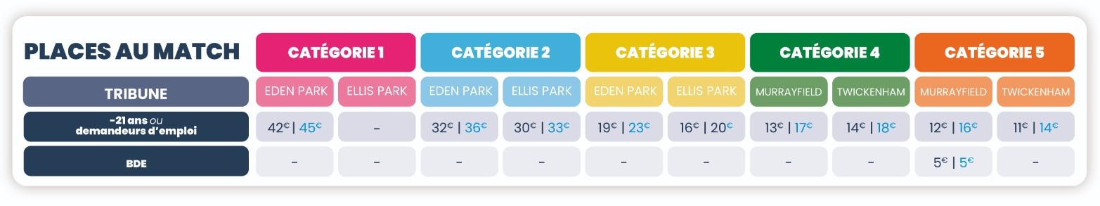 - Ton École ou ta fac a un BDE, un BDS ou une association étudiante, tu peux bénéficier d'une place à partir de 5€ en tribune Eden Park latérale gauche (catégorie 3). Ils te donneront le code promo. Et, si le BDE ou le BDS n'est pas encore partenaire, dis-leur de nous contacter rapidement.