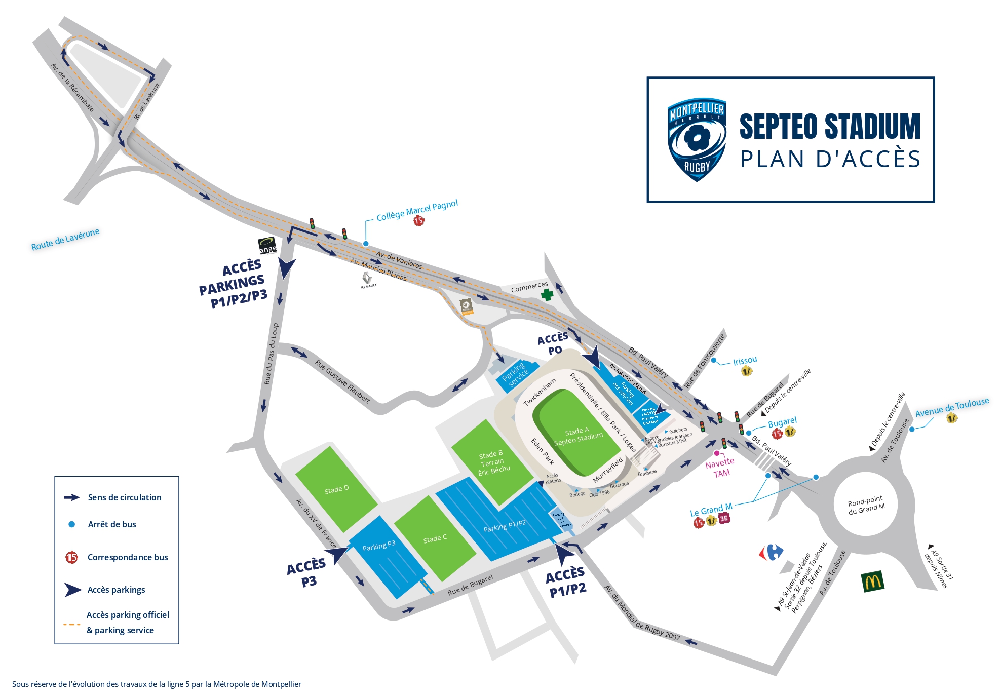 Chers supporters, en raison des travaux de la ligne 5 du tramway, la circulation autour du stade est fortement impactée.